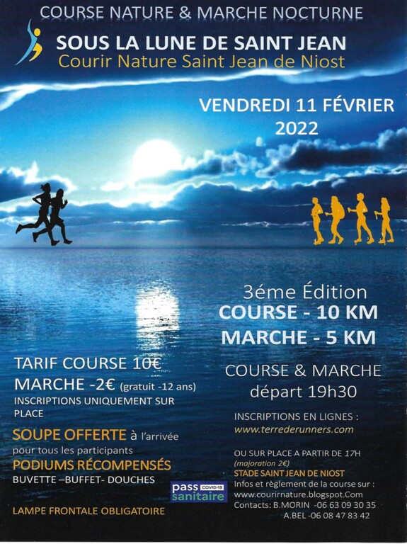 Le vendredi 11 février 2022, l'association COURIR NATURE SAINT JEAN DE NIOST organise la course nocturne de 10 km : SOUS LA LUNE DE SAINT JEAN.